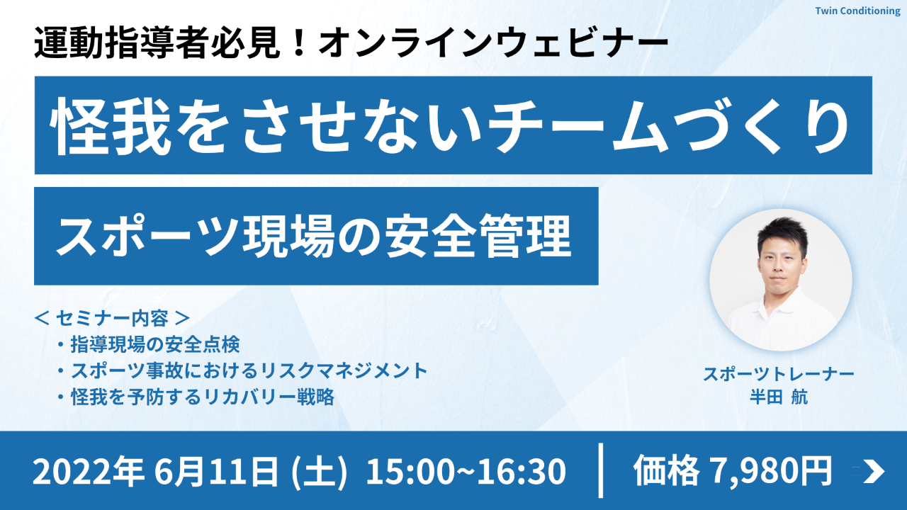 Twin Conditioningが開催するウェブセミナーの録画動画です。「怪我をさせないチームづくり」をテーマに、スポーツ現場における安全管理の考え方と実践方法について学ぶことができます。スポーツ協会主催のセミナーとして開催された内容を動画で視聴する形式です。購入後、メールで届く視聴ページからいつでもご覧いただけます。